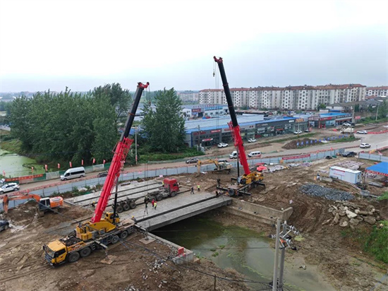 6月27日上午,漢川市泵站河橋至城隍轉(zhuǎn)盤段改擴(kuò)建工程幸福渠橋梁板吊裝完成。