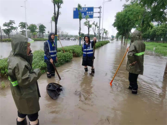 一聲令下,全體人員立即趕赴現(xiàn)場(chǎng)。暴雨期間,他們?cè)跁?huì)展南路下穿通道前設(shè)置警戒線,在奧體大道陳家溝大橋南側(cè)疏通雨水收水口,在會(huì)展南路東延段肖坡河沿岸挖排水溝槽,將排水管道中的大泥塊、石塊、垃圾等清出管道,保證道路及道路兩側(cè)積水順利排入河中。