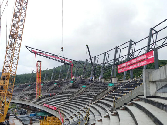 8月23日上午,鄖西縣文化體育中心項(xiàng)目A區(qū)鋼結(jié)構(gòu)第一榀主桁架首吊成功。