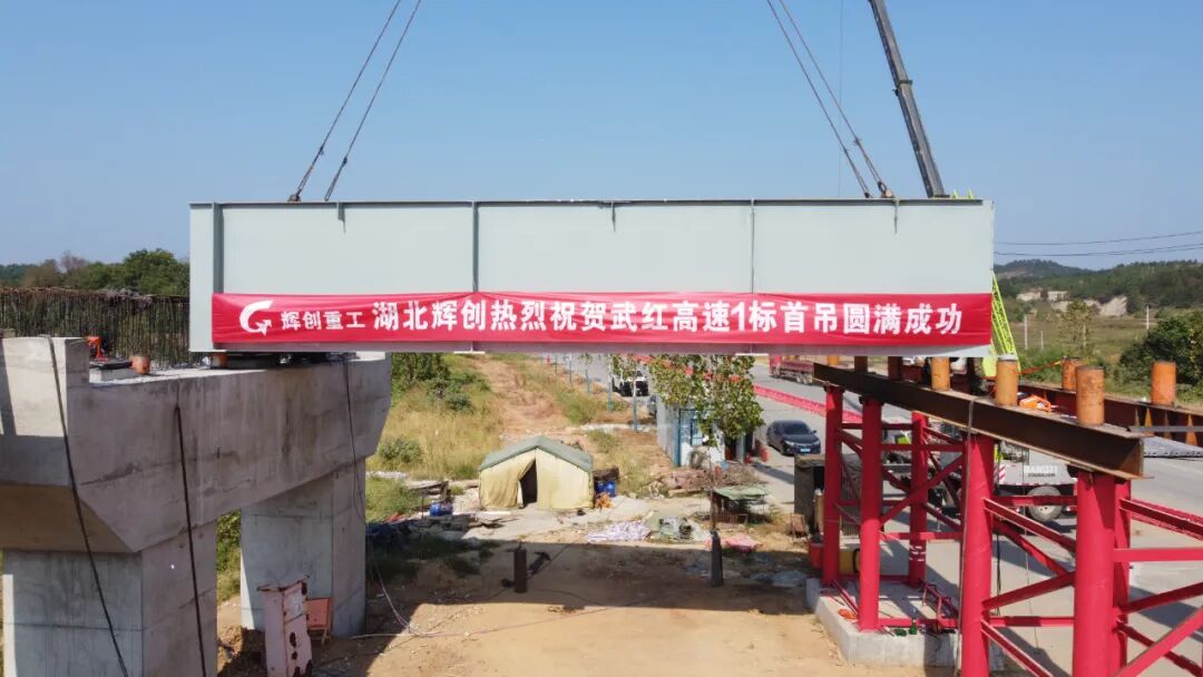 9月19日,隨著起重機(jī)將36噸的鋼箱梁緩緩吊起,在各方參建人員的注視下,鋼箱梁穩(wěn)穩(wěn)落在支架上,宣告武紅高速項(xiàng)目首榀鋼箱梁吊裝成功。