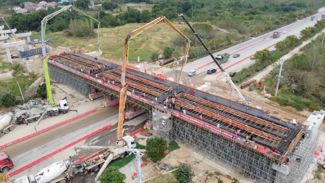 9月25日早上6點(diǎn),隨著第一車混凝土抵達(dá)施工現(xiàn)場(chǎng),兩臺(tái)天泵同時(shí)開工,現(xiàn)場(chǎng)全體施工人員迅速進(jìn)入施工狀態(tài),武紅高速項(xiàng)目首榀現(xiàn)澆箱梁開始澆筑。